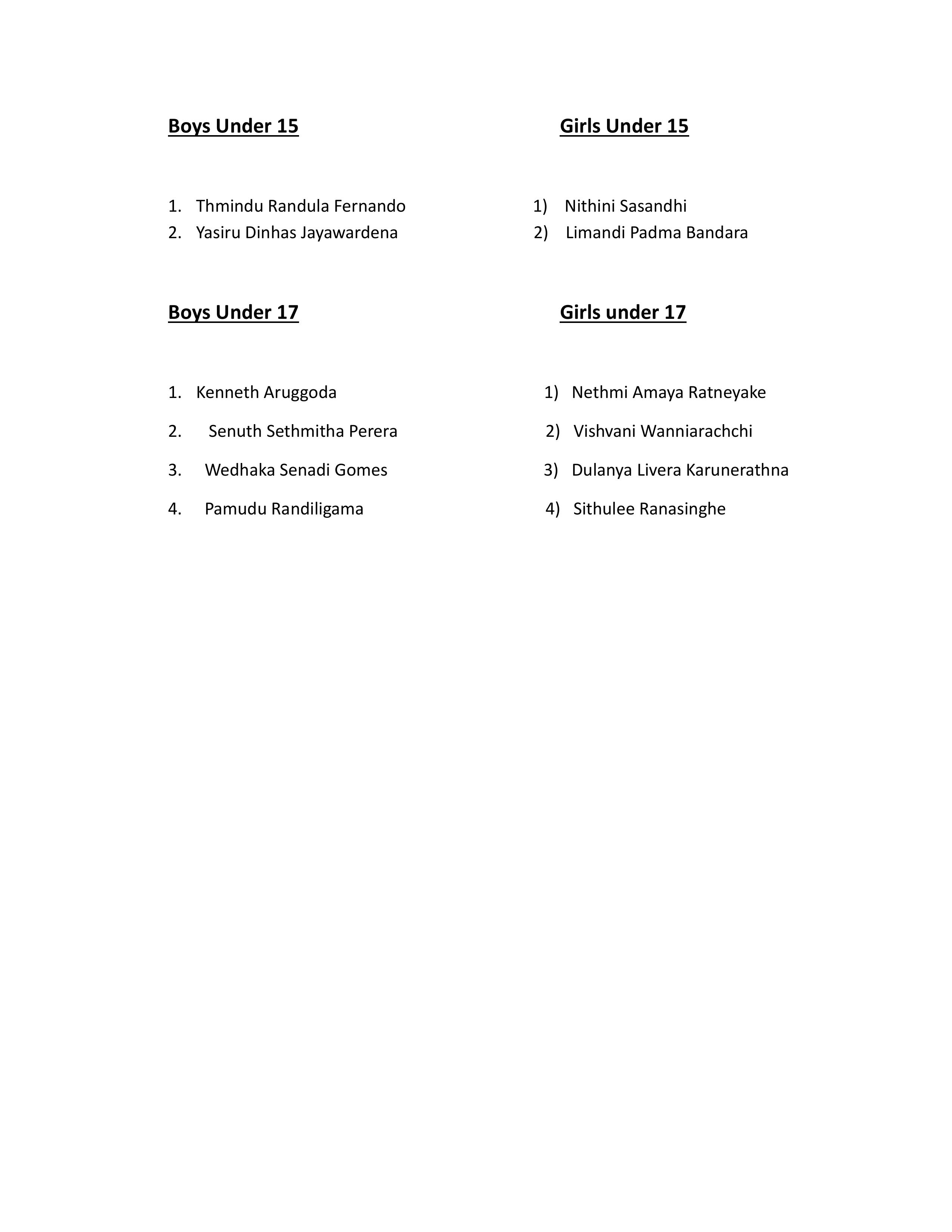 As instructed by the Chairmen Selection Committee, the following players are invited to face Selection Trials to select the Team for the above championship. The Trials will be held on 10th June (Tuesday) at the Mercantile Badminton Courts. The participation at the Games will be on self-funded basis. A meeting with all players and parents will be held on 9th June (Monday) at 4:30 pm. The details and format of holding the trials will be notified by the Selection Committee. Boys Under 15 • Thmindu Randula Fernando • Yasiru Dinhas Jayawardena Girls Under 15 • Nithini Sasandhi • Limandi Padma Bandara Boys Under 17 • Kenneth Aruggoda • Senuth Sethmitha Perera • Wedhaka Senadi Gomes • Pamudu Randiligama Girls under 17 • Nethmi Amaya Ratneyake • Vishvani Wanniarachchi • Dulanya Livera Karunerathna • Sithulee Ranasinghe