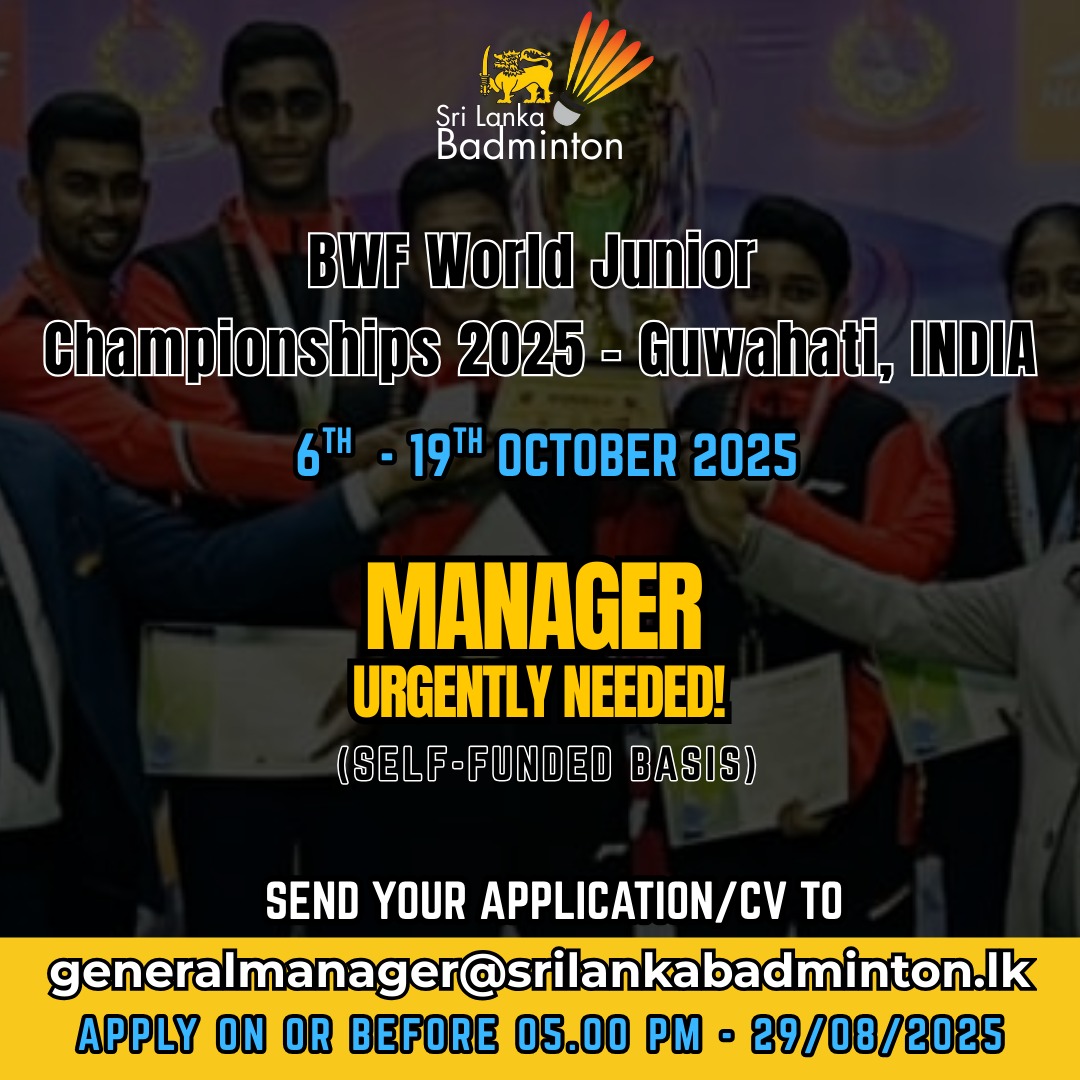 Sri Lanka Badminton is seeking applications for the position of Team Manager (Self-Funded Basis) for the upcoming BWF World Junior Championships 2025, to be held in Guwahati, India from 6th to 19th October 2025. We invite interested and eligible individuals to apply by sending their CV/Resume to: [email protected] Deadline for Applications: 5.00 PM, 29th August (Friday) 2025 This is a fantastic opportunity to be a part of an international badminton event and contribute to the growth of Sri Lankan badminton on the world stage.