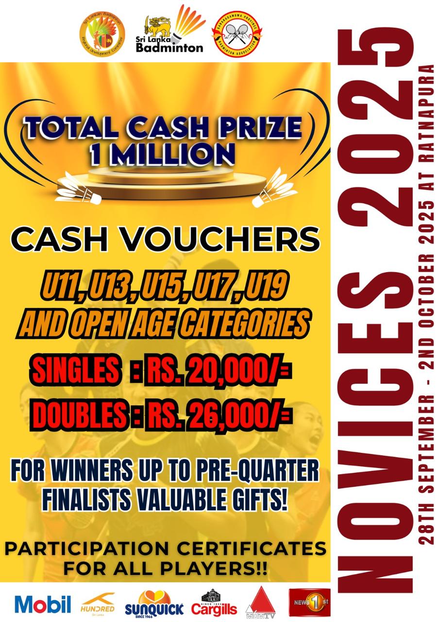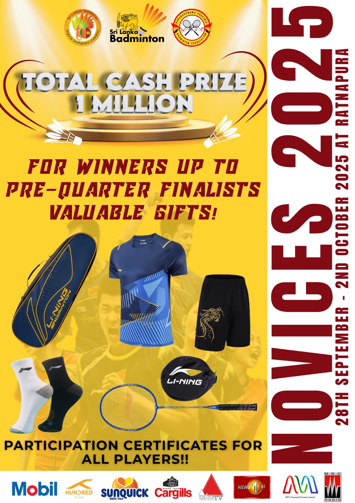 Sri Lanka Badminton is proud to announce the NOVICES 2025 – All-Island Open and Age Group Badminton Championships, to be held from 28th September to 2nd October 2025 in Ratnapura. This prestigious tournament offers valuable gifts for winners up to pre-quarter finalists and participation certificates for all players. With a total cash prize fund of Rs. 1 Million, players also stand the chance to win cash vouchers across all categories – U11, U13, U15, U17, U19, and Open. Cash vouchers will be awarded as follows: Singles – Rs. 20,000 and Doubles – Rs. 26,000 We warmly invite all players to register soon and be part of this exciting championship. The entry deadline is 19th September 2025.