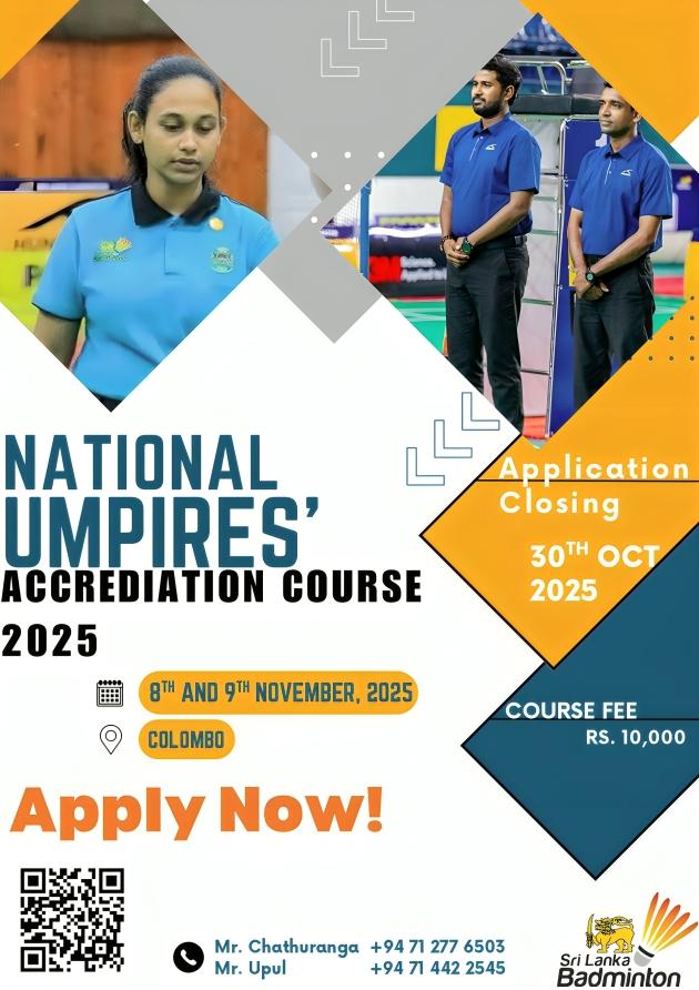 The National Umpires' Accreditation Course will be held in Colombo on the 8th and 9th of November 2025. Applications will close on the 30th of October 2025. The course fee is Rs. 10,000. For further details, please contact Mr. Chathuranga at +94 71 277 6503 or Mr. Upul at +94 71 442 2545. Apply now to secure your place! Application Link: https://forms.gle/t9Anr9fcN7tcsfPh8